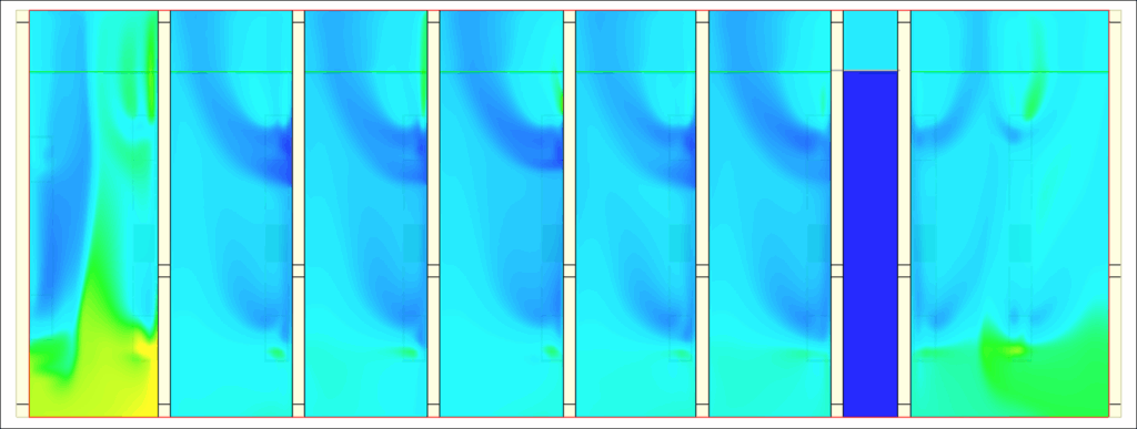 I nostri strumenti di modellazione numerica, e in particolare i metodi di fluidodinamica computazionale (CFD), ci permettono di analizzare con precisione la distribuzione delle temperature, delle velocità dell’aria e delle pressioni nella stanza durante i test su banco di carico. Grazie a questo approccio, è possibile rappresentare graficamente i pennacchi termici, le zone di ricircolo, i gradienti di pressione e i flussi indotti dalle apparecchiature di prova.
