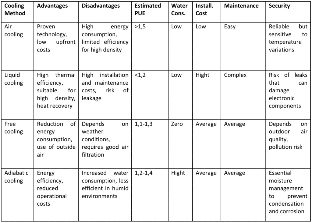 L’efficienza energetica e l’impatto ambientale dei data center dipendono in gran parte dai sistemi di raffreddamento utilizzati. Questa sezione analizza i diversi metodi di raffreddamento in base a criteri quali l’efficacia di utilizzo dell’energia (PUE), il consumo energetico, l’impronta ecologica, i vincoli tecnici, i costi associati e la sicurezza.